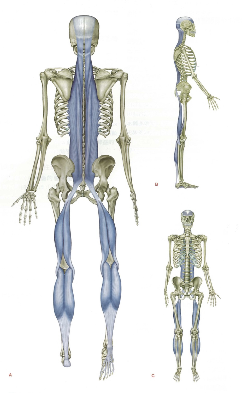 淺背線的路徑分成了兩個部分,從足底到膝蓋,從膝蓋到額頭。就像包覆著整個身體背面的盔甲 一般 ,一路從足底到頭提供連接與保護的功能。